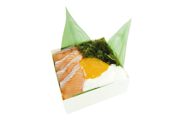 - 【完全陸上養殖】の「サーモン・海ぶどう すし箱」は、静岡の富士山麓で育った日本初陸上養殖の国産アトランティックサーモンと、大阪府堺市にある大起水産まぐろパークに設置したコンテナ型陸上養殖設備で育てた海ぶどうを使用。卵黄ソース、とろろ、ごま油を使った特製だれを混ぜて一緒にいただくと、サーモンと海ぶどうの旨味が際立ちます。