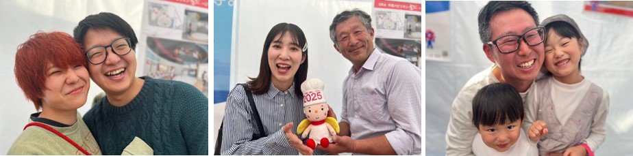 そんな中“ORA外食パビリオン「宴~UTAGE~」”では、広報本部やボランティアスタッフ、事務局が参加しORAならびORAパビリオンの認知度向上や公式SNSの登録者数拡大に務めました。またパビリオン1階天井部分に掲示する予定の笑顔の写真の撮影も行い、多くの皆様の素晴らしい笑顔の写真を撮影することが出来ました。当ブースは、万博の機運も高まってきたこともあり両日共に多くの来展者で賑わい、2025大阪・関西万博に出展する“ORA外食パビリオン「宴~UTAGE~」”の認知度向上や来館促進を図ることが出来ました。